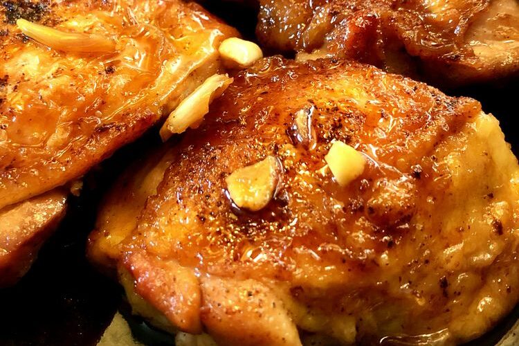 Arrange chicken thighs skin-side down in the pan. Place crushed garlic between the chicken and fry until fragrant, about 30 seconds. Add honey, water, vinegar, and soy sauce. Increase heat to medium-high and cook until sauce reduces down and thickens slightly, 3 to 4 minutes.