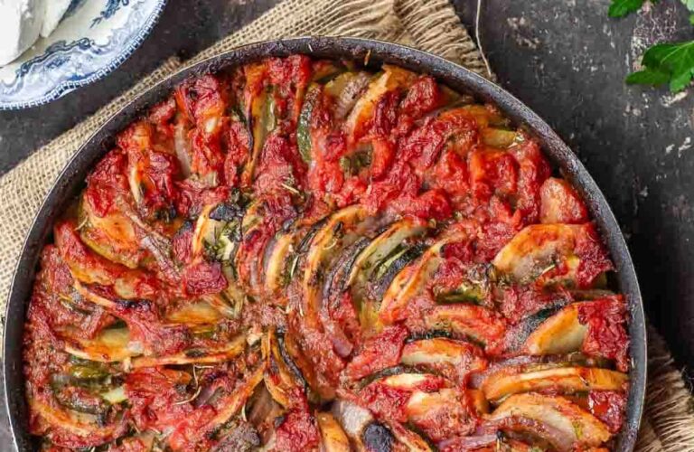 6. Remove from heat, then arrange the seasoned potatoes, tomatoes, zucchini, and sliced onions in the pan in rows (simply going around the shape of the pan and alternating.)