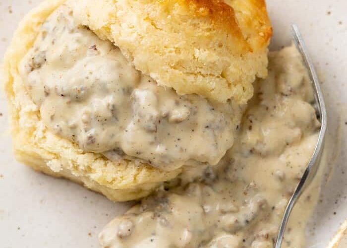 • Sprinkle the flour over the sausage and stir to incorporate. Increase heat to medium and cook for 2 minutes, until you can no longer smell flour.